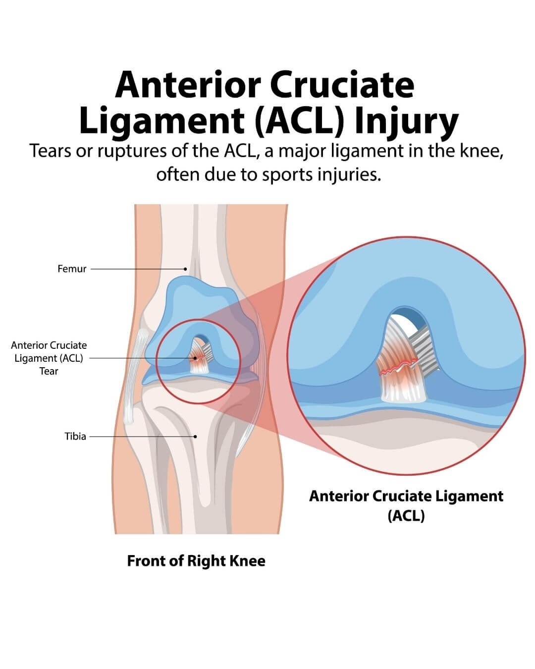 ACL tears often do not occur alone. In many patients, twisting injury also damages the meniscus, which is the cushioning cartilage inside the knee.
